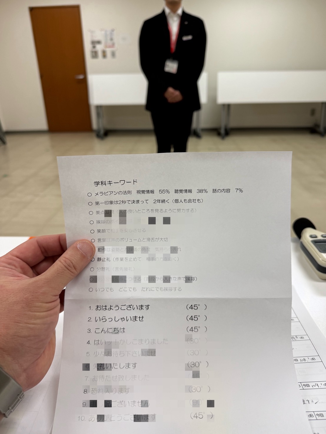 その後 基本接客用語を大きな声で行っていただき 笑顔や声のボリューム お辞儀の姿勢などを評価していきます