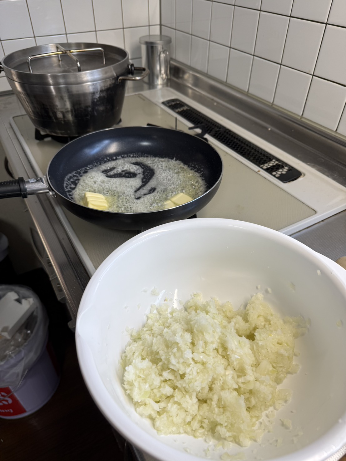 玉ねぎは 手動のフードプロセッサーでみじん切りにし 多めのバターで炒めます