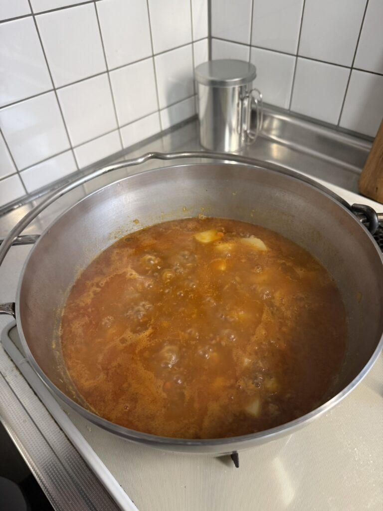 ワイン 野菜ジュースで煮込み にんじんのみじん切りと ジャガイモを投入