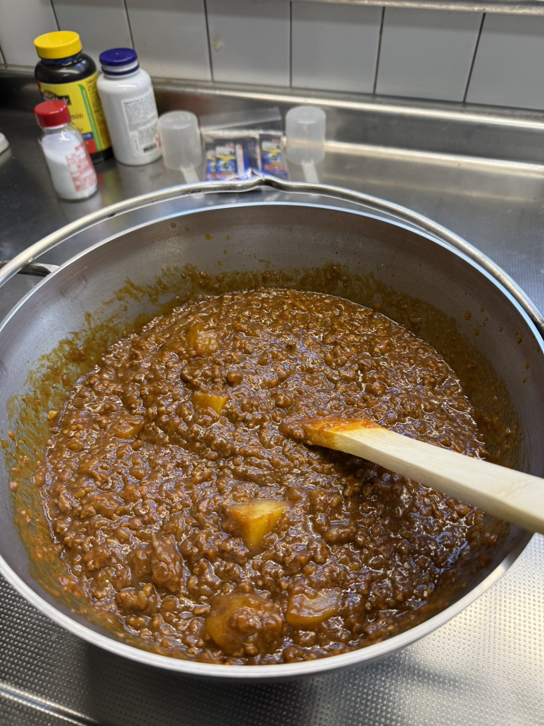 市販のルーと もろもろ調味料で味を調えたら 完成です