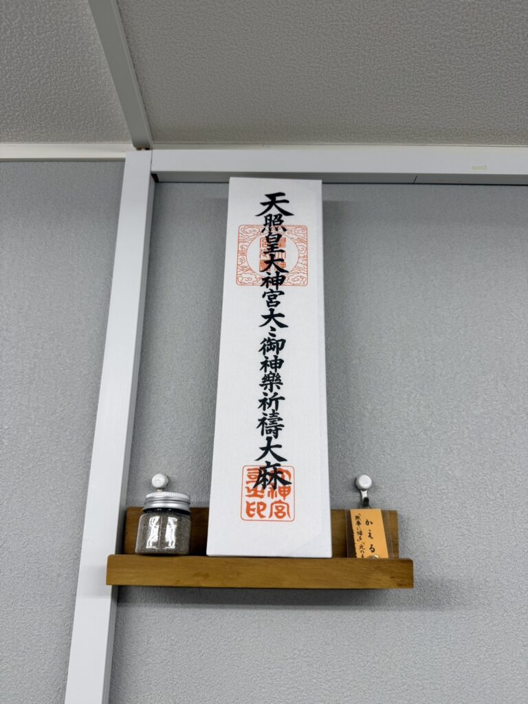弊社の粗末な神棚に 先日伊勢内宮より賜りました神札を納めました
