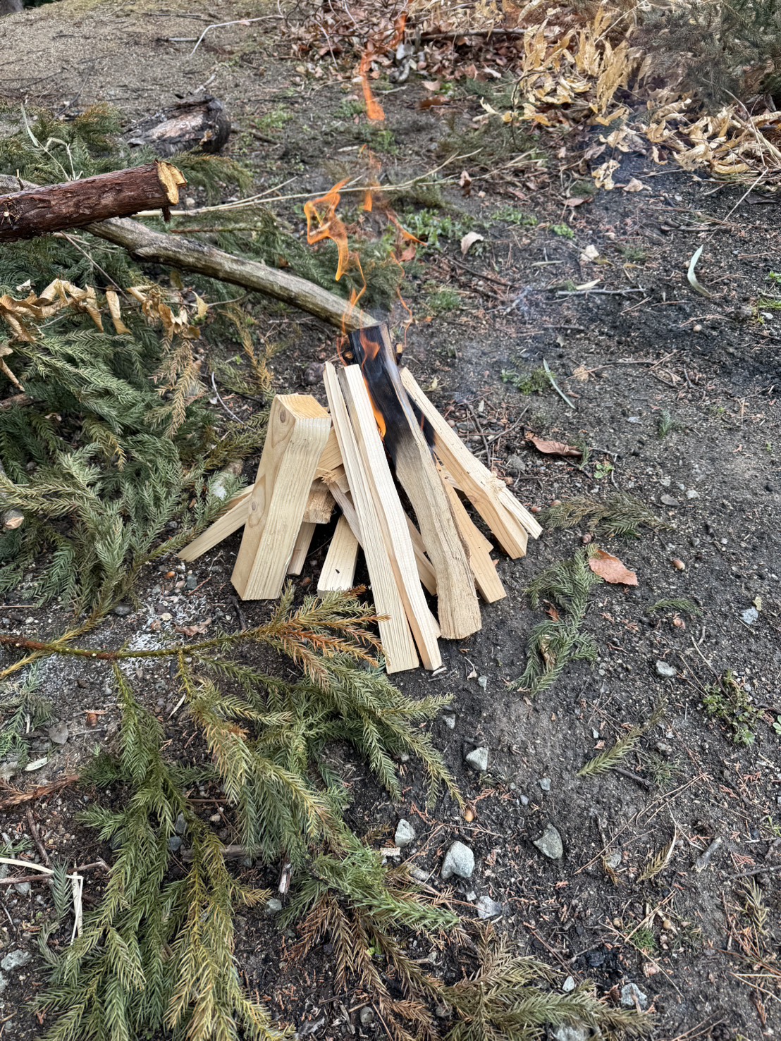 風も無く 絶好の焚火日和ですが いかんせん雪で枝や葉が湿っているので 焚き付け用の材木で火お越しです