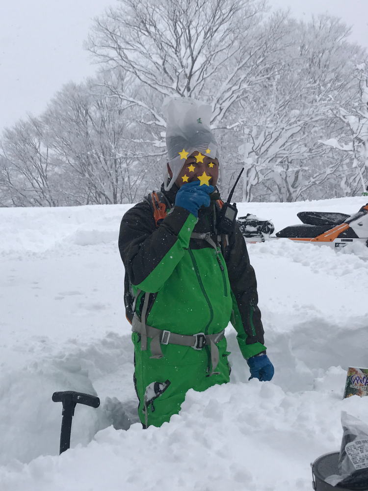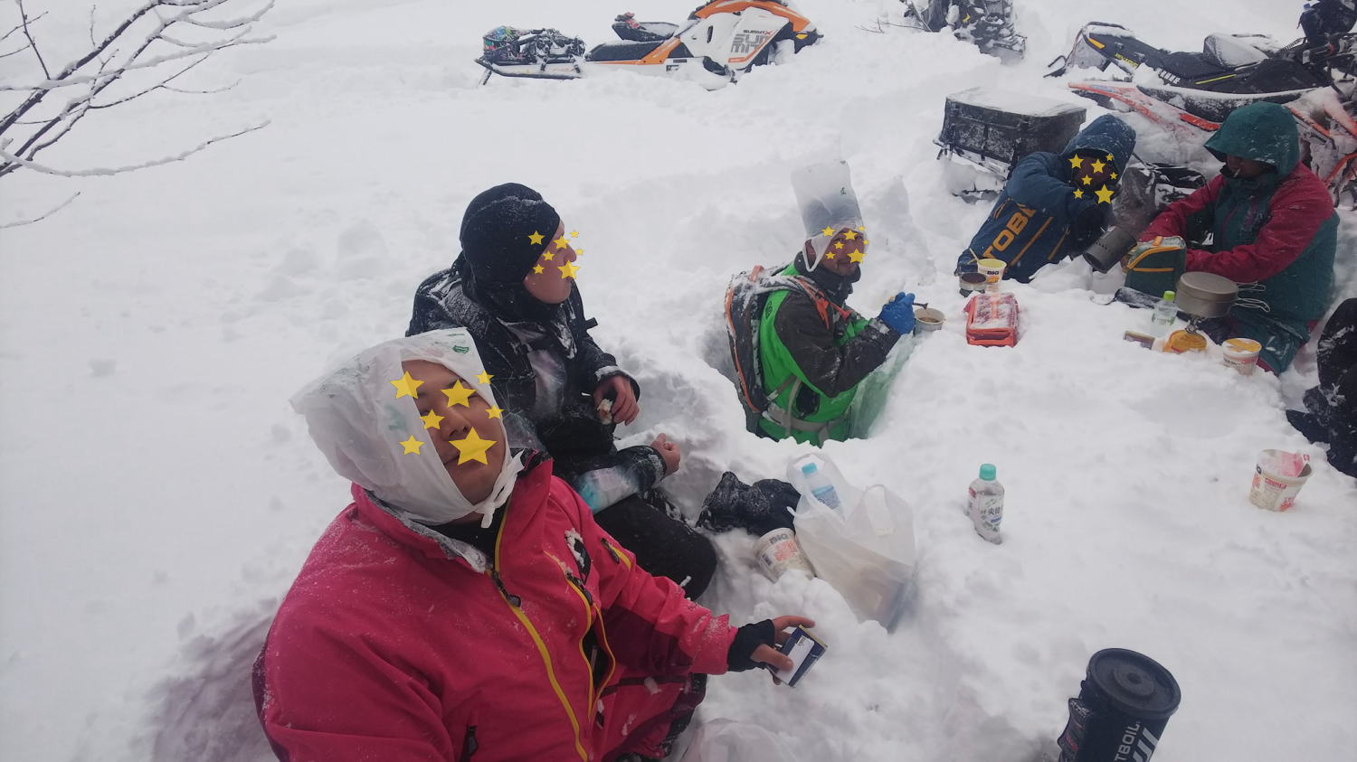 雪でテーブルをつくり 皆でカップラーメンをすすります