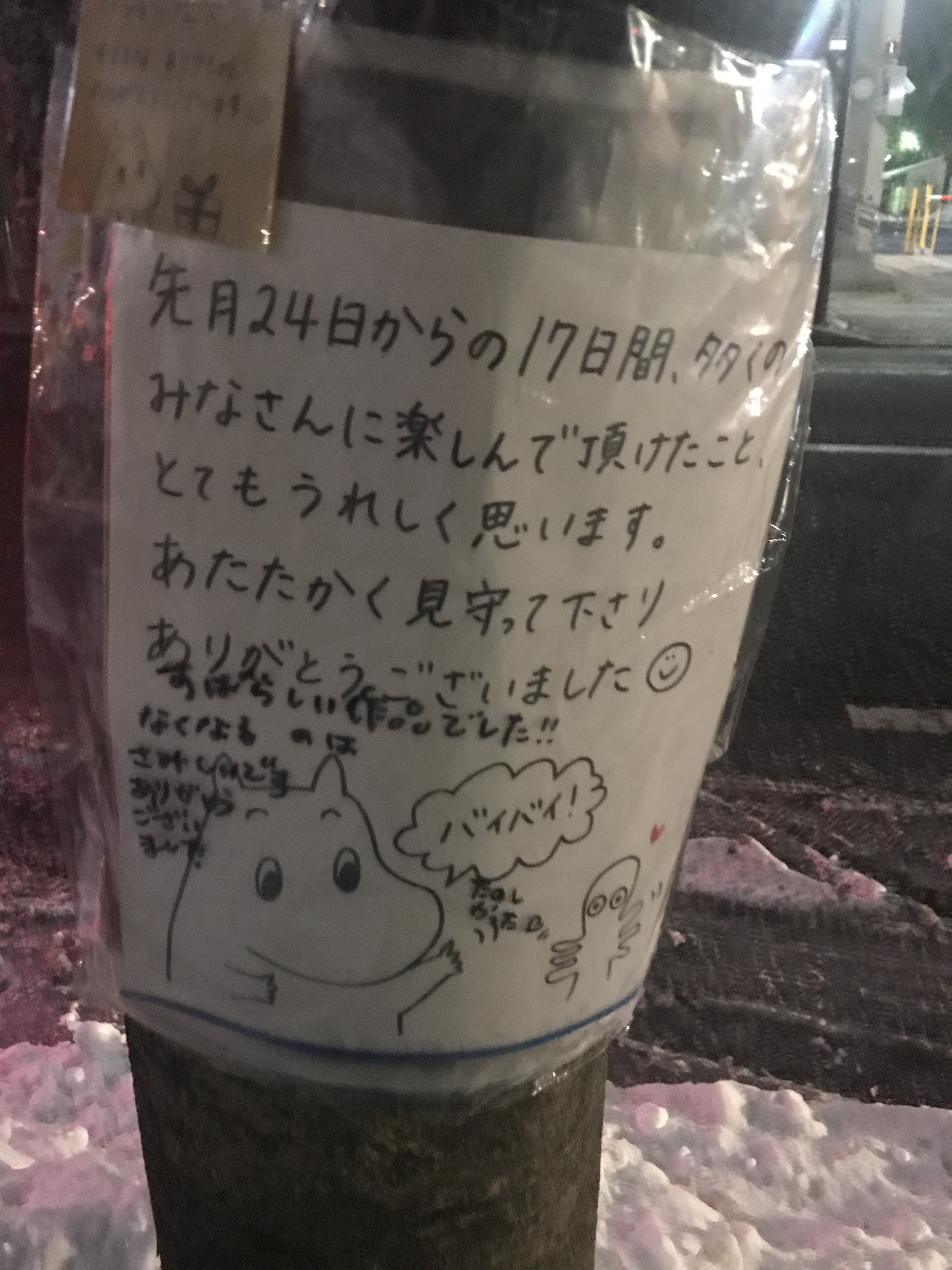 貼紙 一月の終わりに降った雪で作られた 近所の「ムーミン雪像」が撤去されていました 日に日に小さく溶けていたので いつかはこうなるなぁと思っていました 無くなった雪像の替わりに 貼紙が。。。。 こういうやり取りが出来るって素敵ですね 誰かに頼まれたからやるのではなく 知らない誰かが喜んでくれる事を想像し 行動出来るって凄い事だと思います