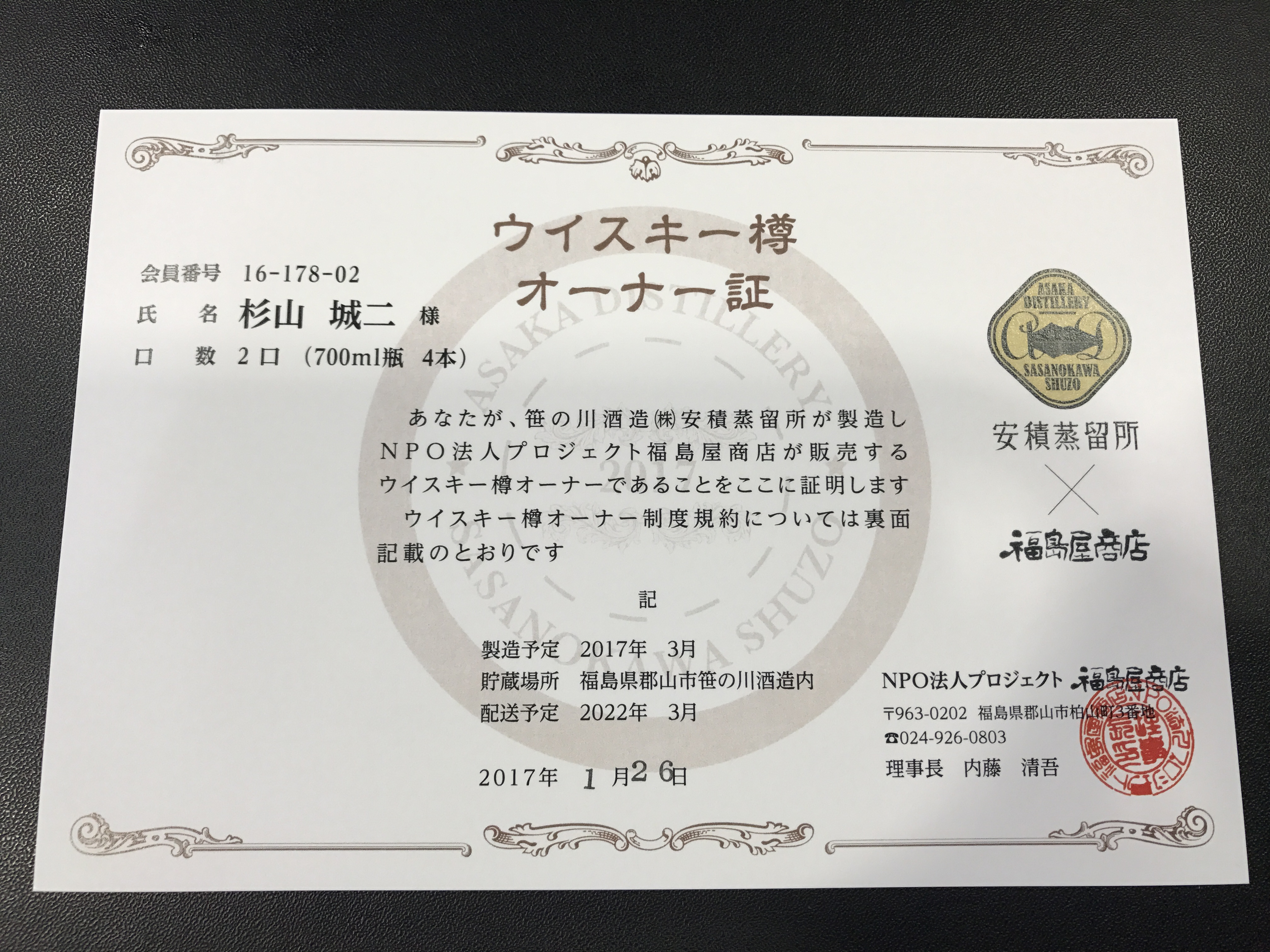 以前登録したウイスキー樽のオーナー証です