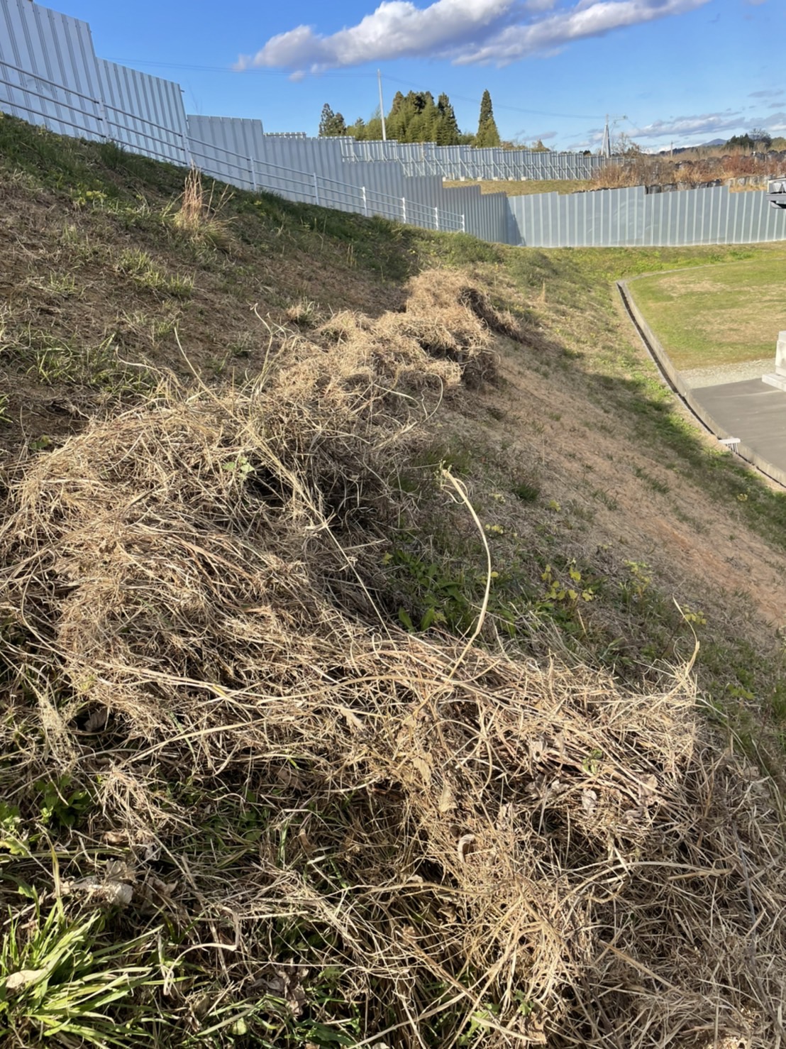 枯草。 夏に草刈りをさぼったせいで 大量の枯草がのり面に残ってしまいました こいつをそのままにしておくと 来年機械で刈る時に邪魔になります せっせと熊手で集めること1時間 バッチリ綺麗になりました このひと手間が大事なんですよ 面倒くさがらず 手間をかける そうすれば おのずと結果は良くなるものです それにしても 腕パンパン