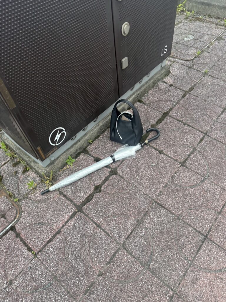 道端に女性ものと思しきバッグと傘が落ちていました