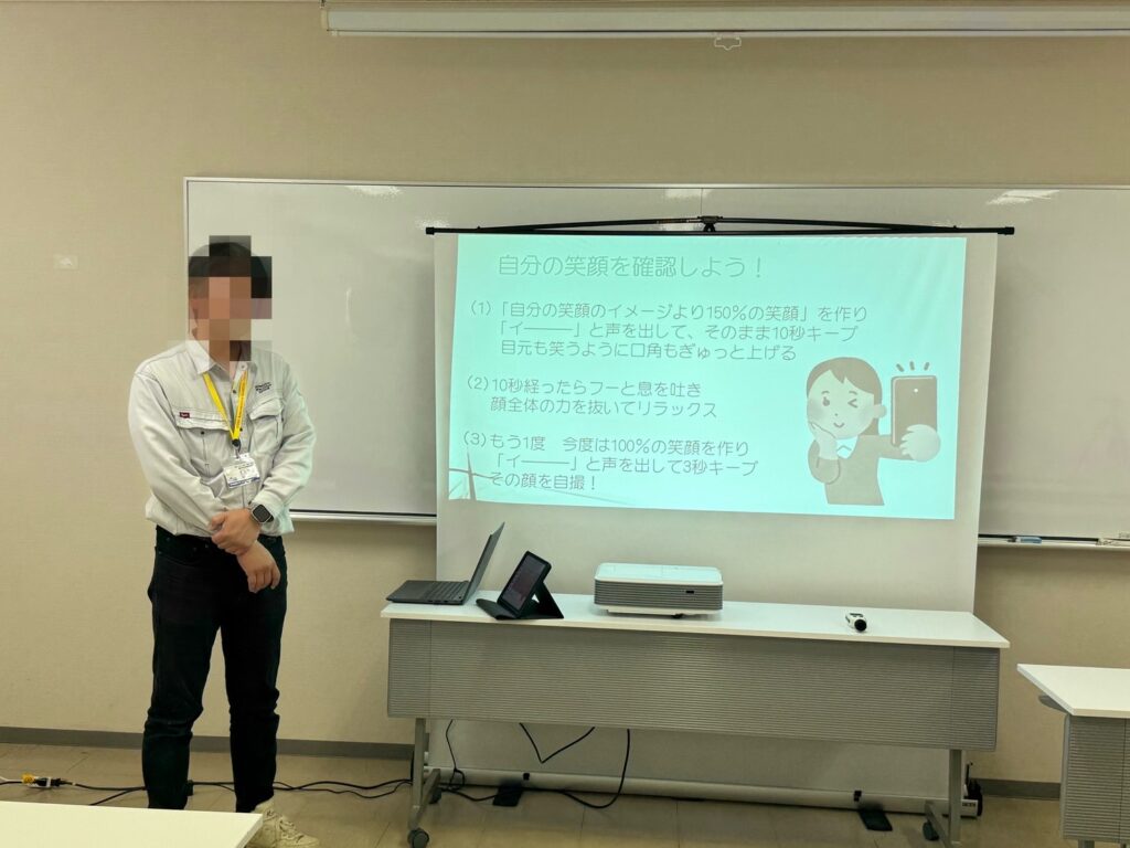 試験内容は 普段私が行っている2時間の挨拶研修のうち 笑顔・言葉・動作の3セクション 約45分の部分を実際に講師として実演して頂くというものです