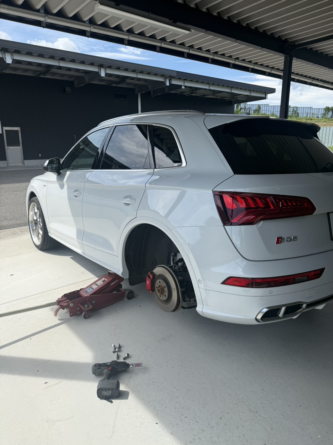腰を痛めないように気を遣いつつ 油圧ジャッキとインパクトを駆使して交換します