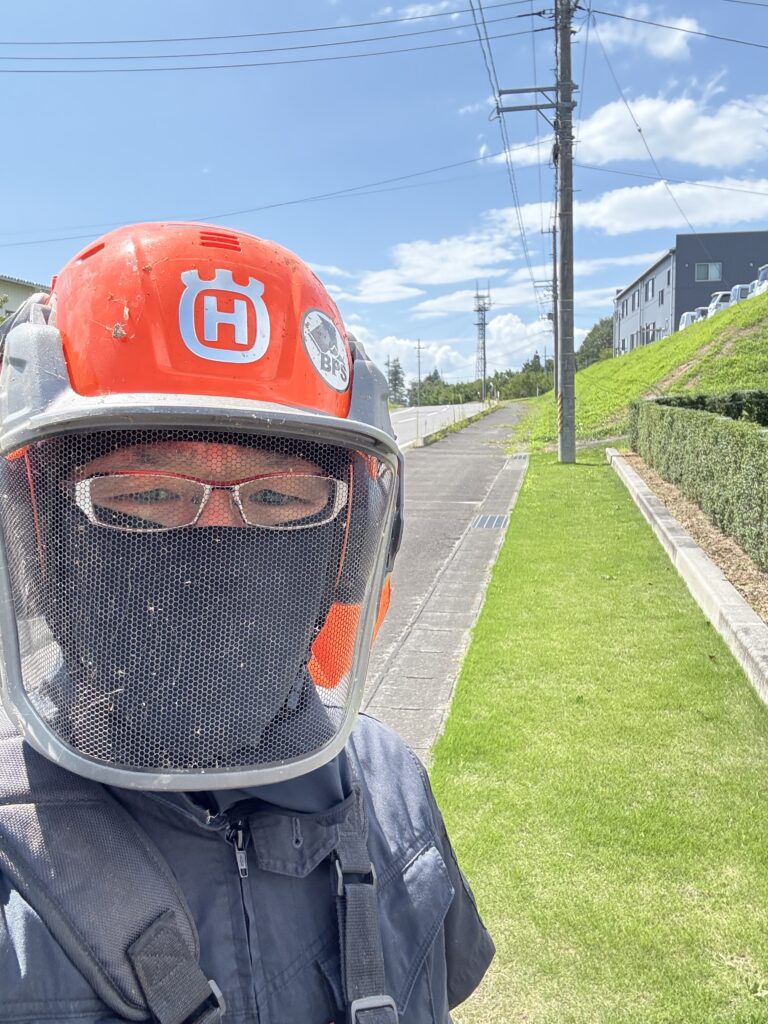 小面積の芝はナイロンコードで刈る派なので フェイスマスクは必需品です