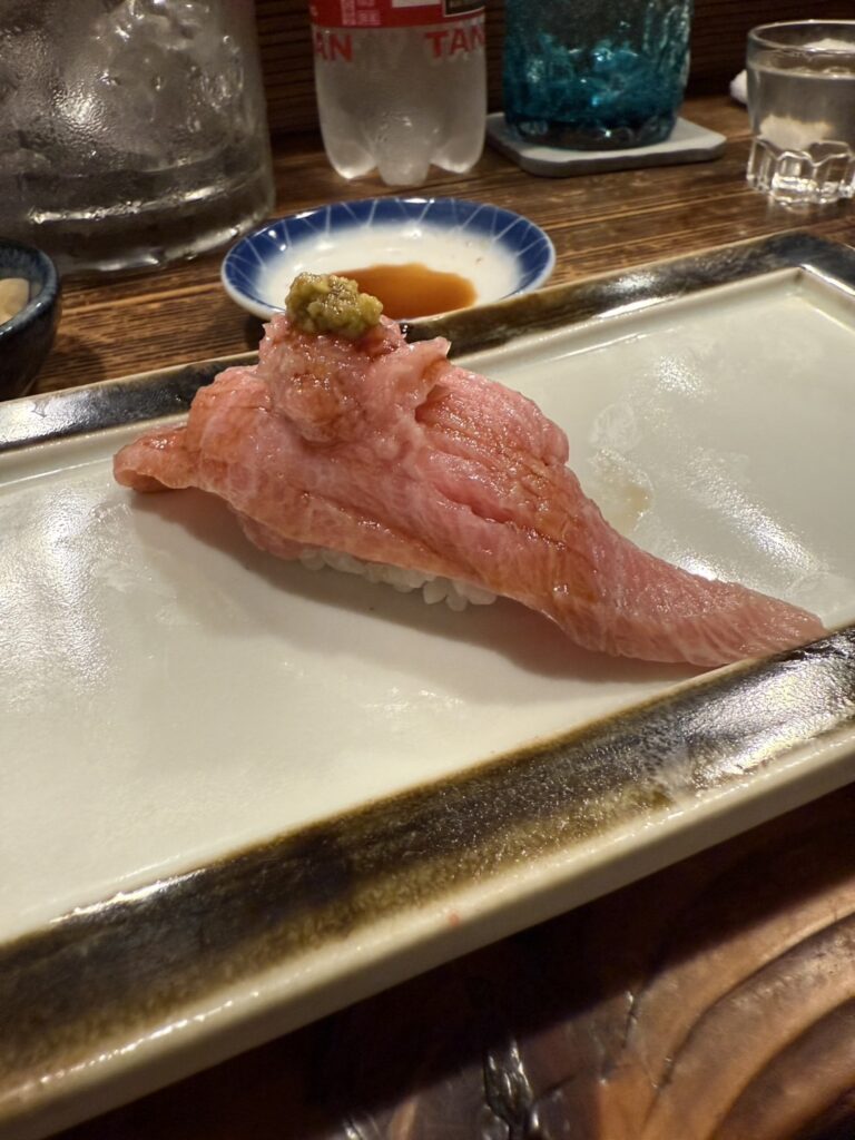 お任せ串は 贅沢にマグロの大トロ部分をレアで焼いてもらいました