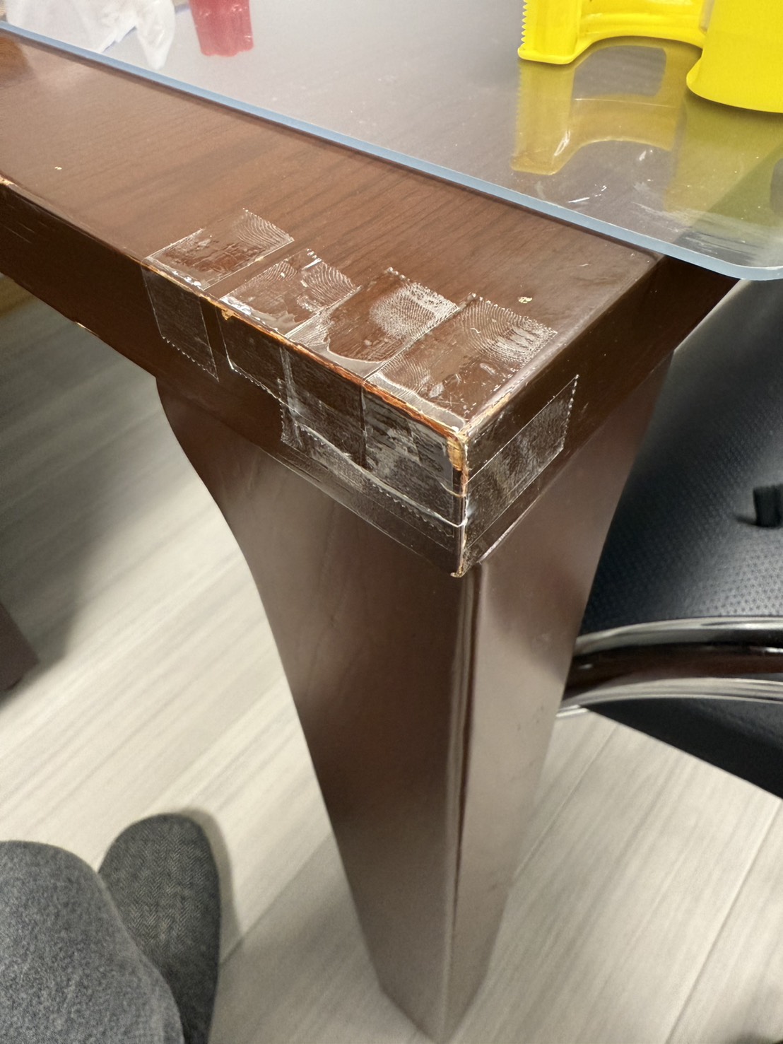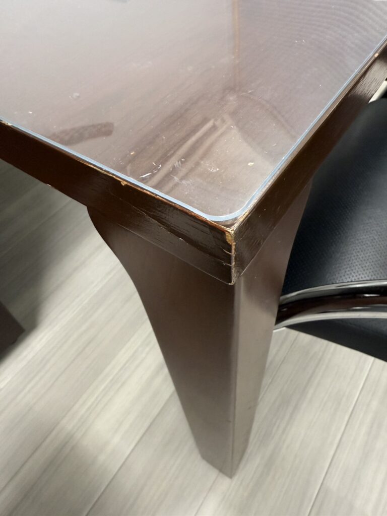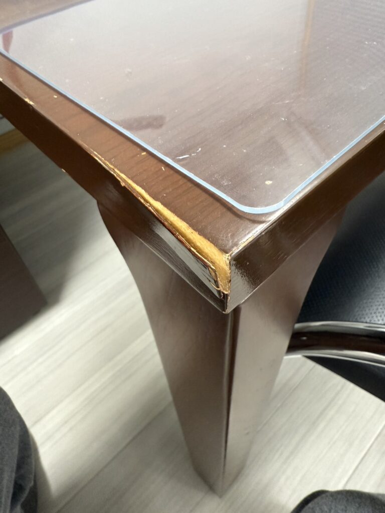 事務所で30年くらい使っているミーティングテーブルの角がめくれているのに 朝気が付きました